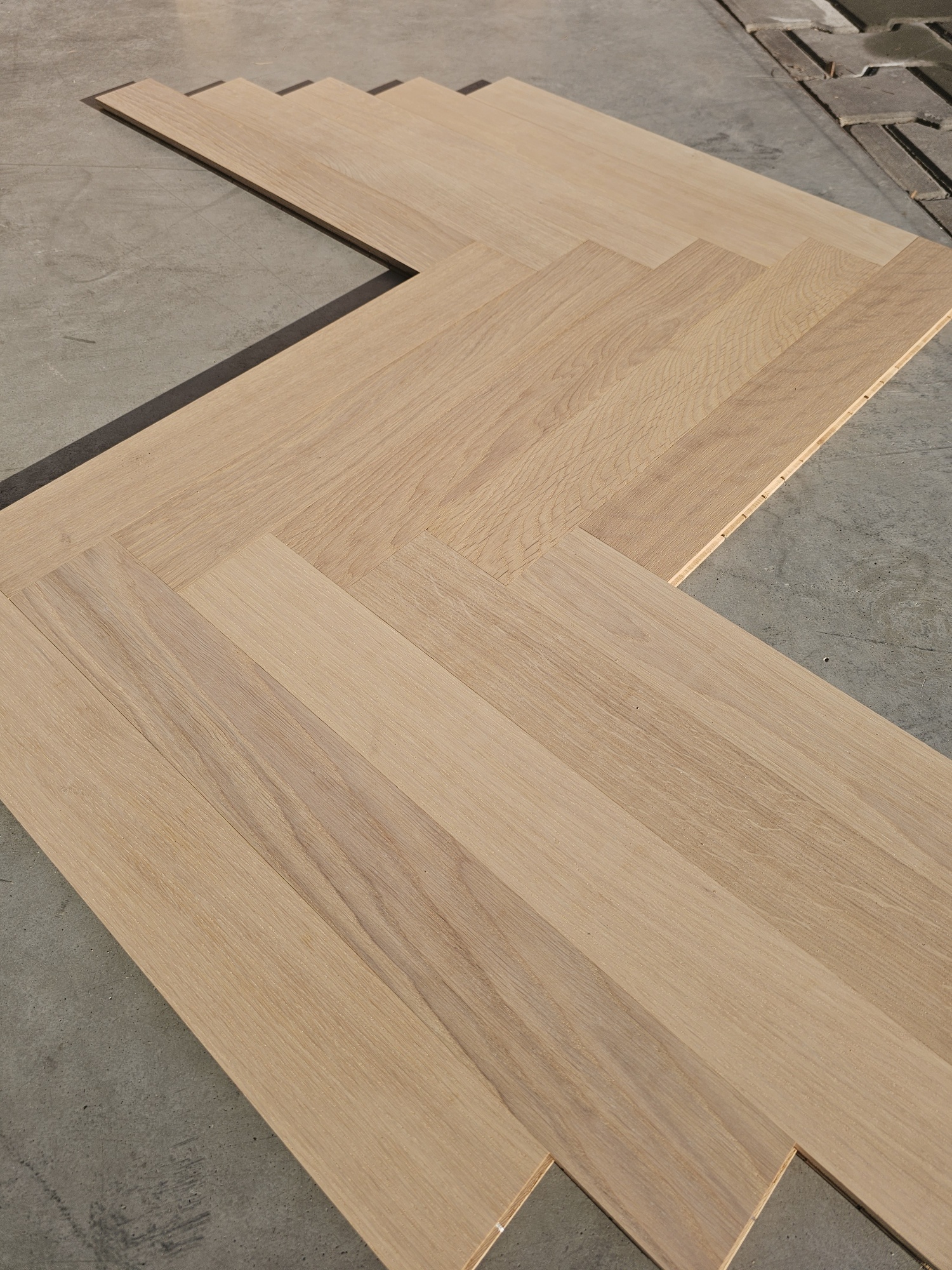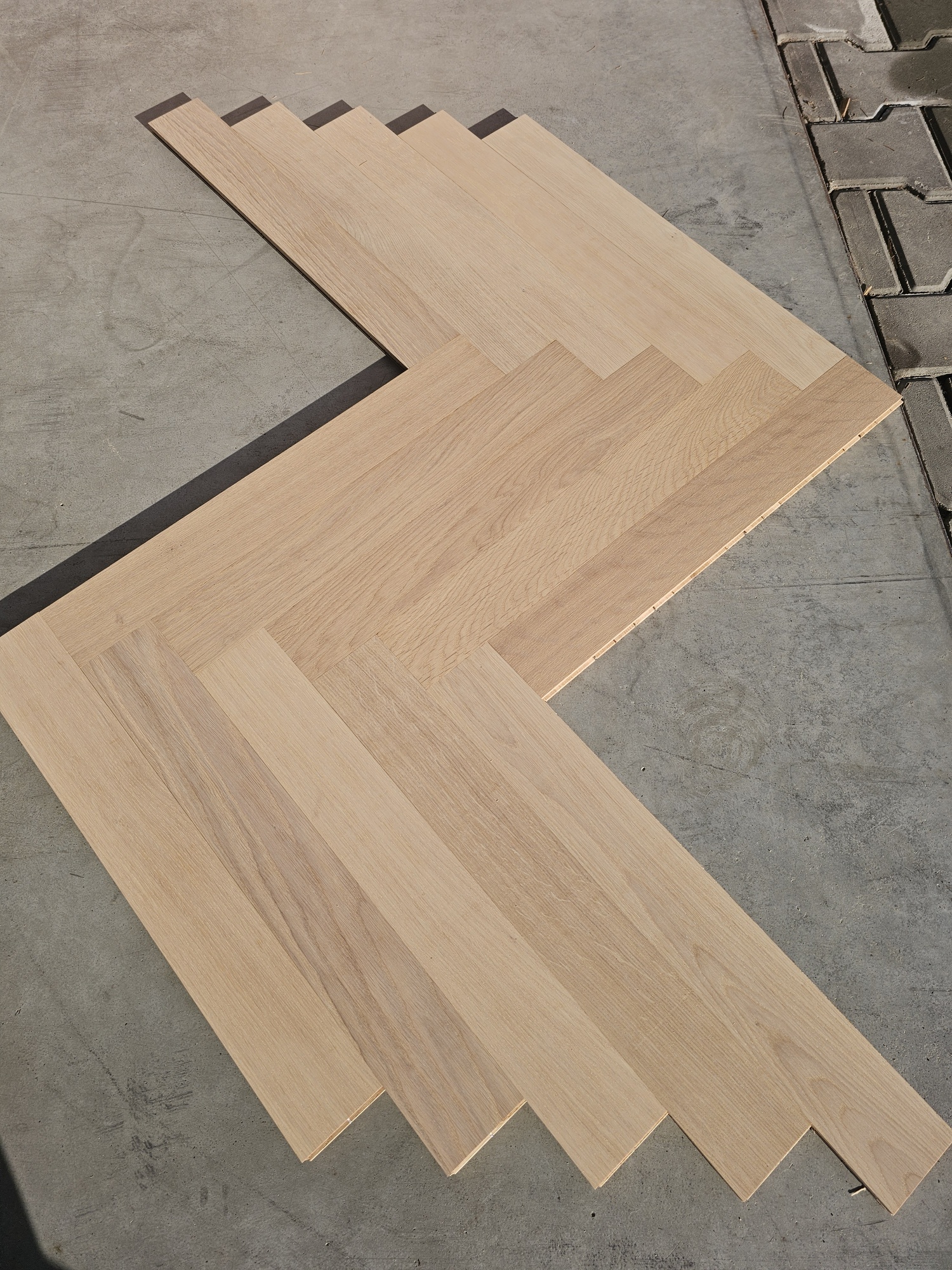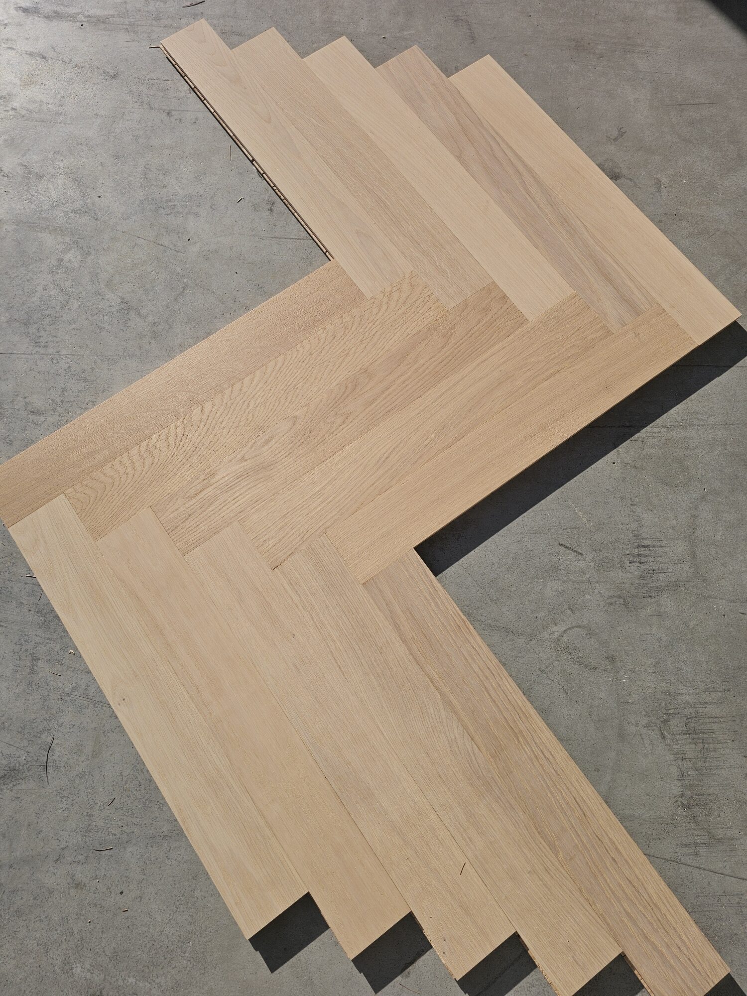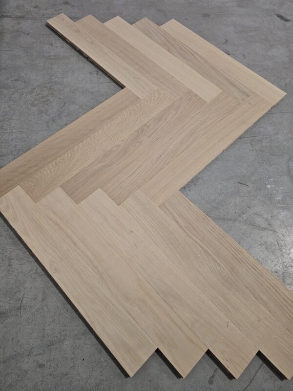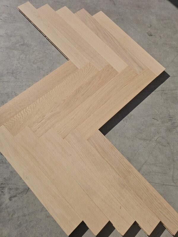 Przepiękny parkiet dębowy (jodełka klasyczna), wstępnie olejowany (biały olej – zalecane nałożenie warstwy pielęgnacyjnej po położeniu)