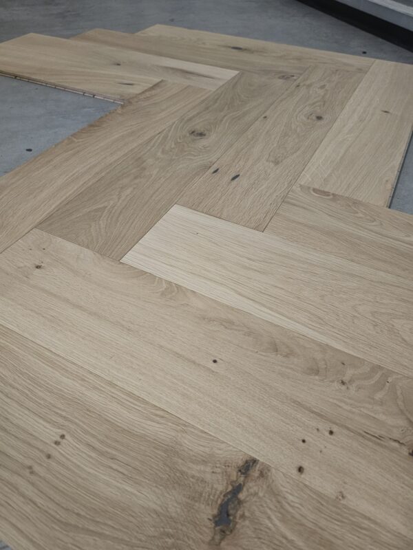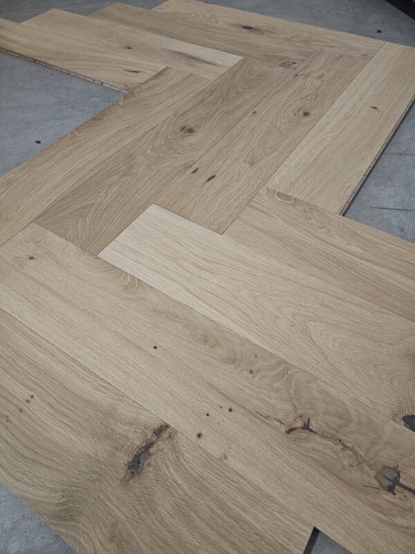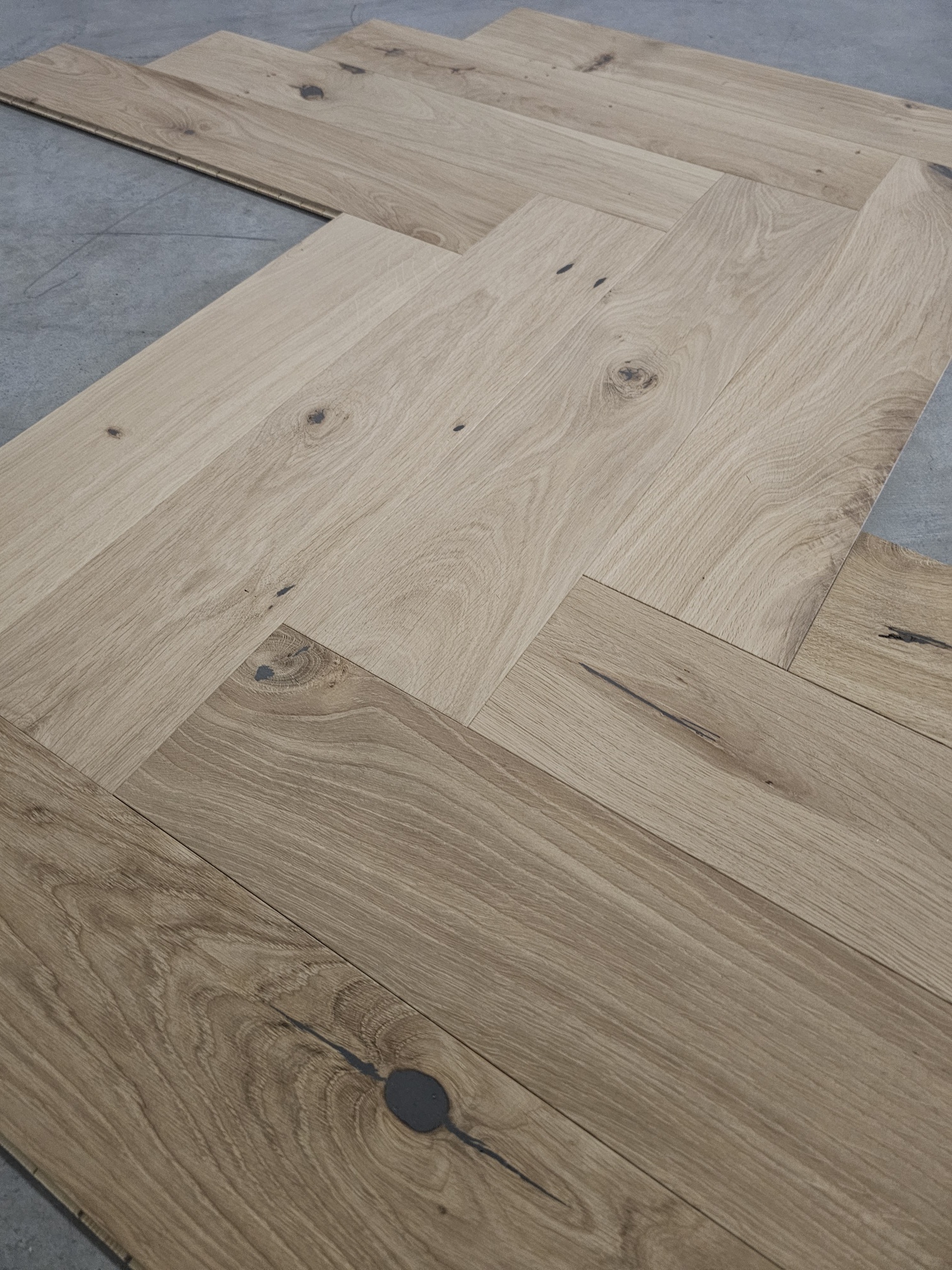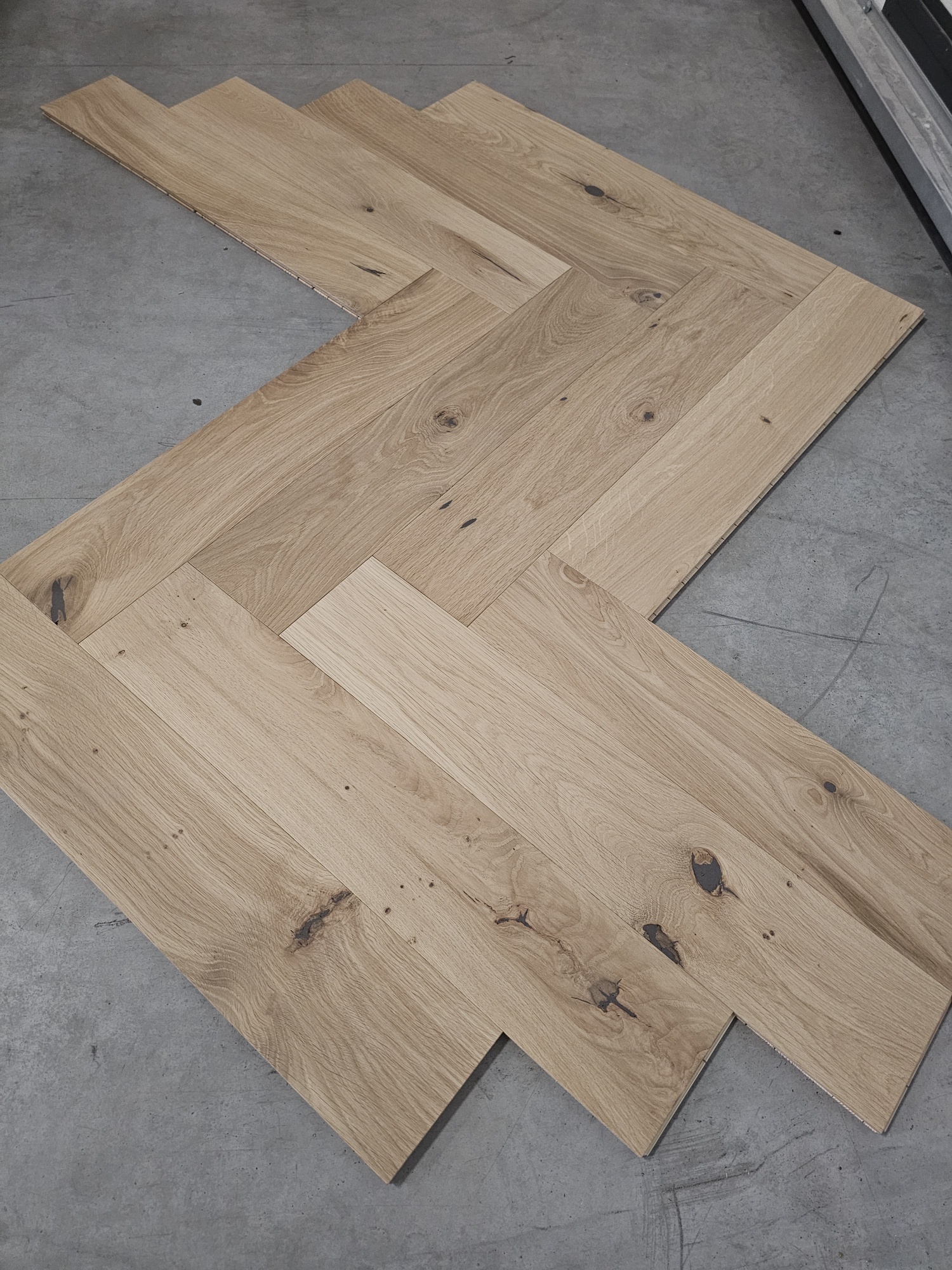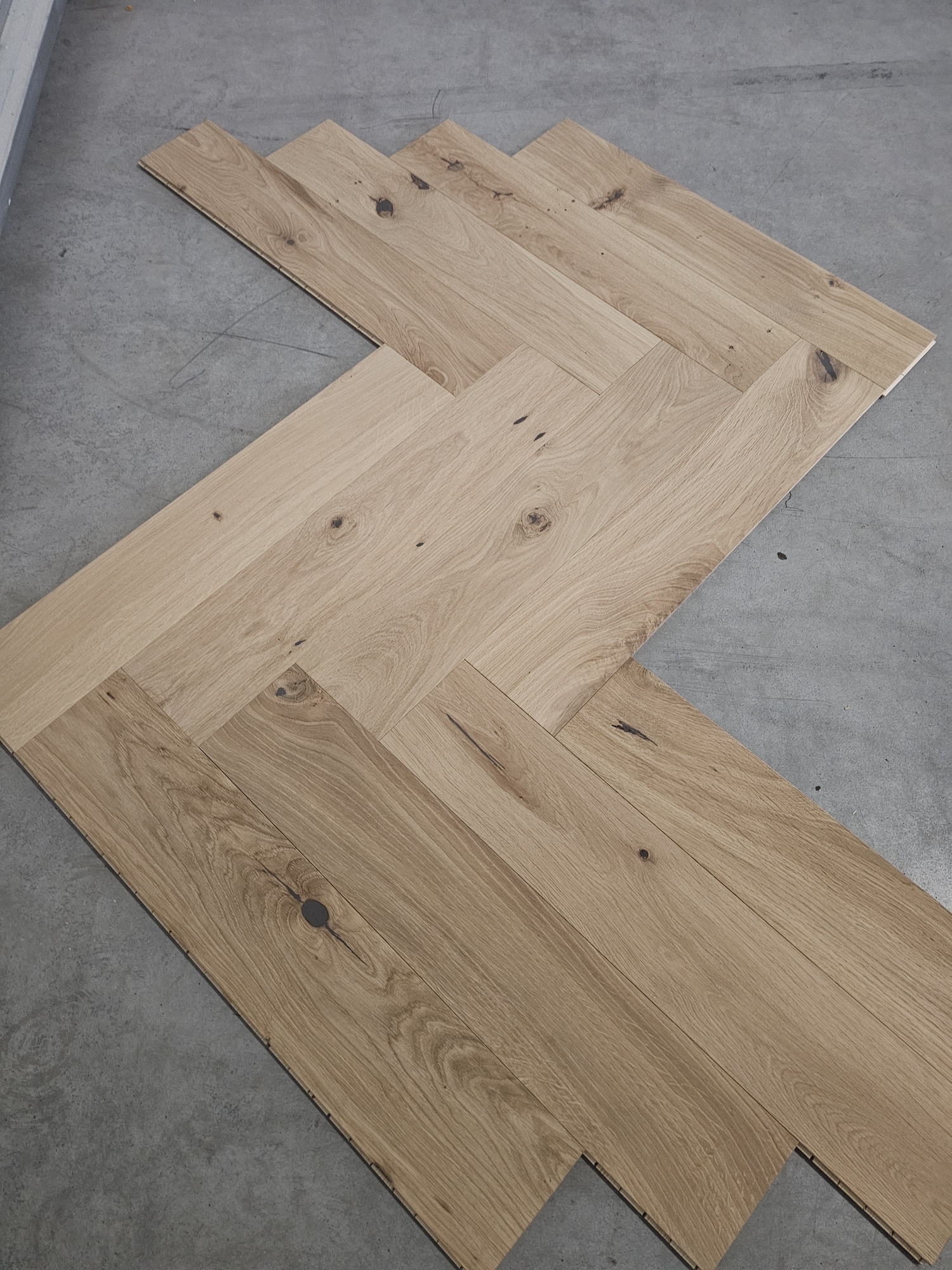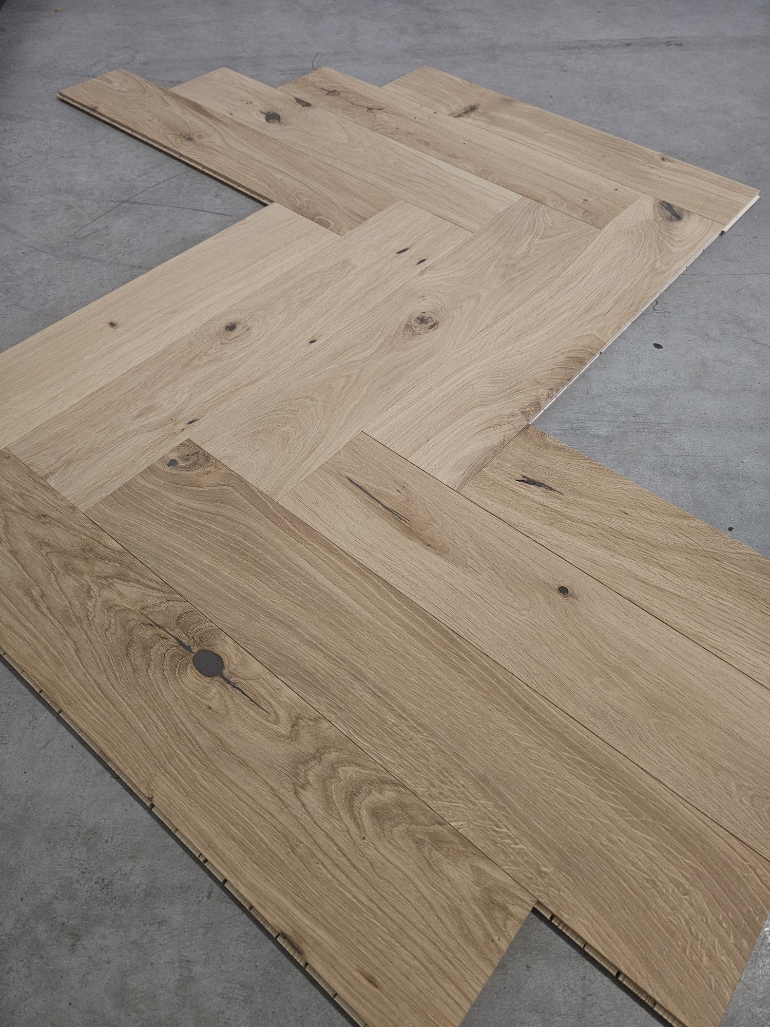 Przedmiotem sprzedaży jest parkiet dębowy (jodełka klasyczna), 2-warstwowy,surowy, 4-stronnie fazowany, szczotkowany Produkt dedykowany na ogrzewanie podłogowe.