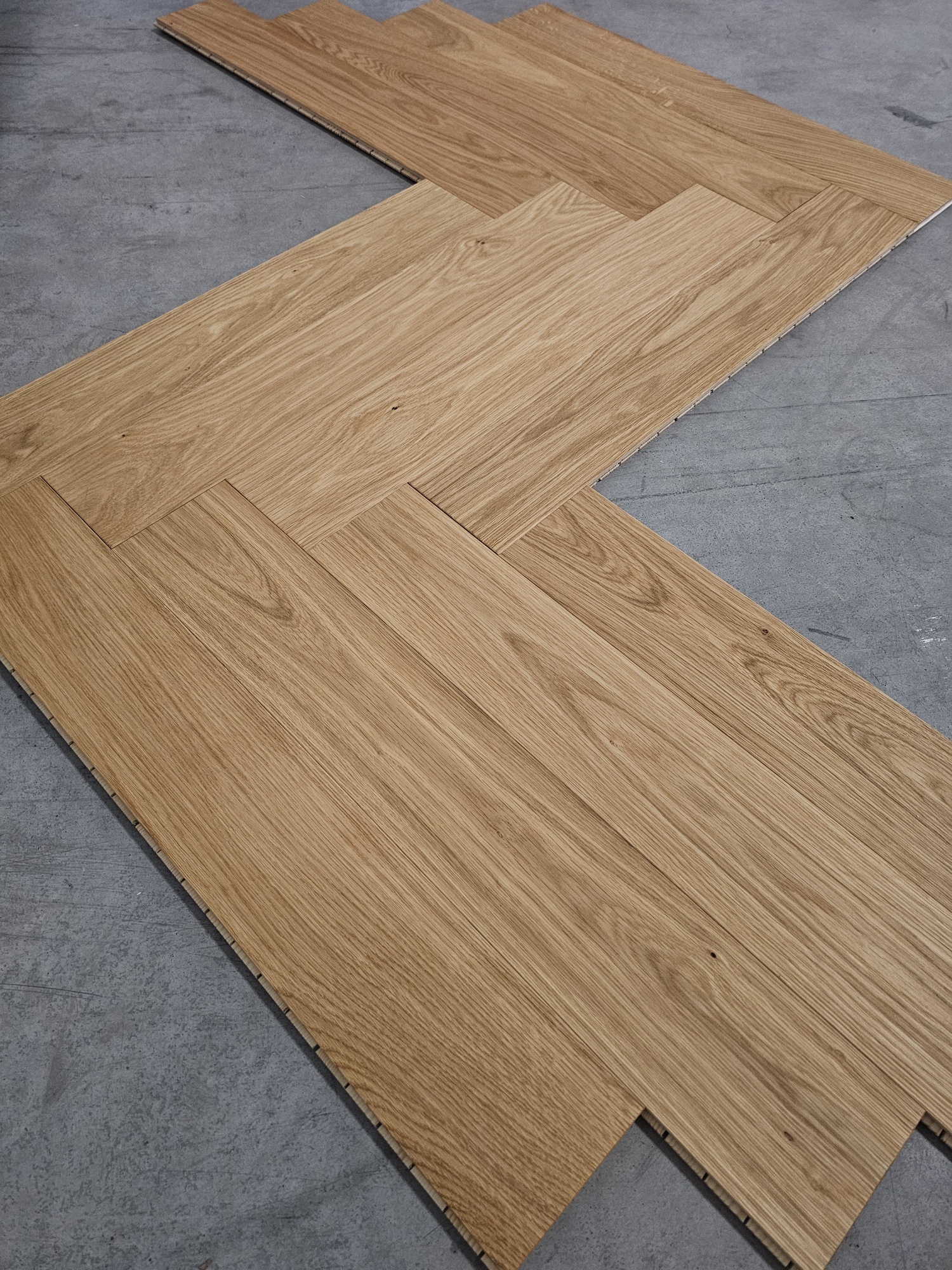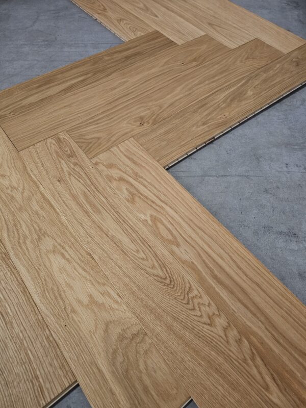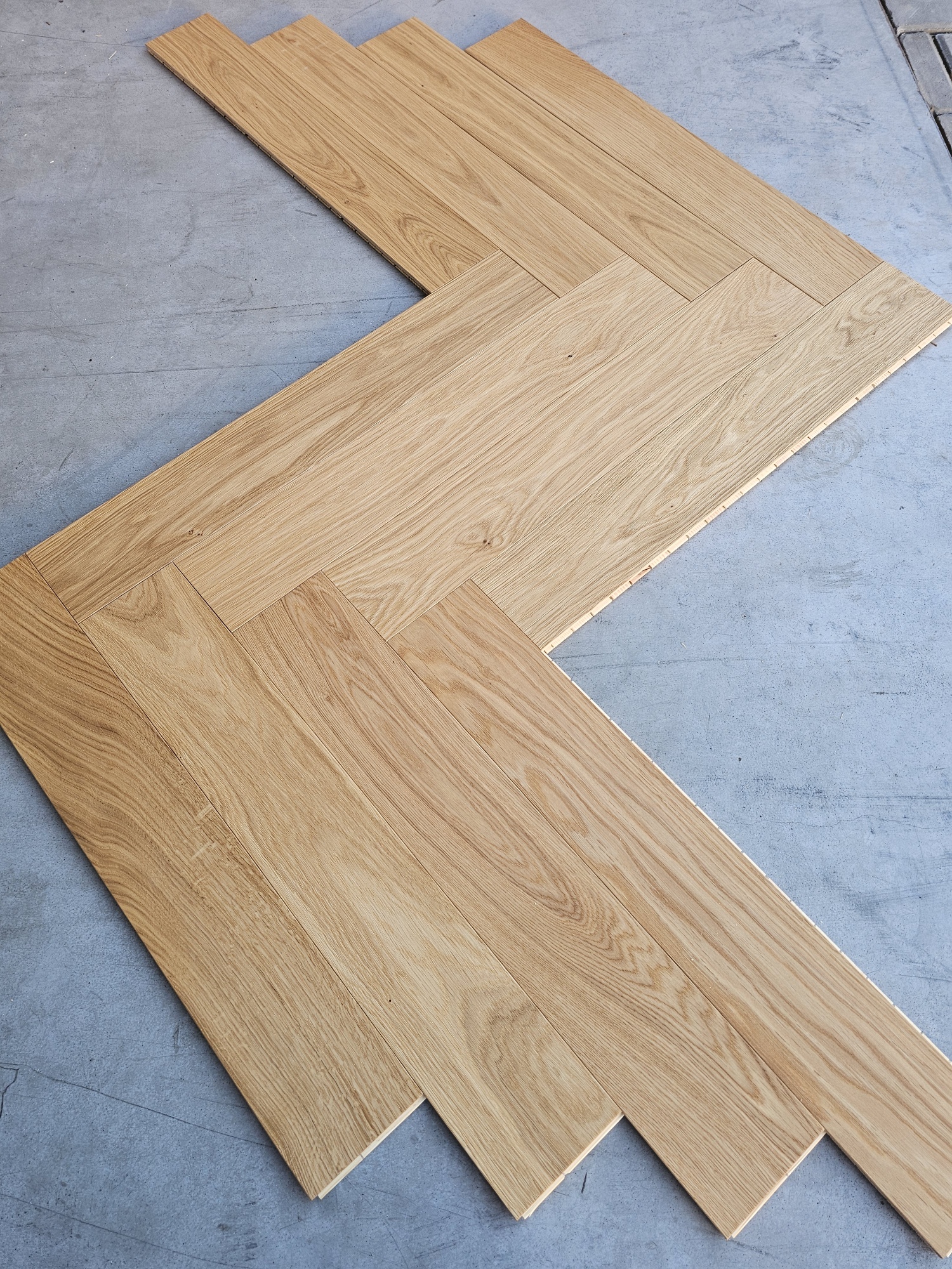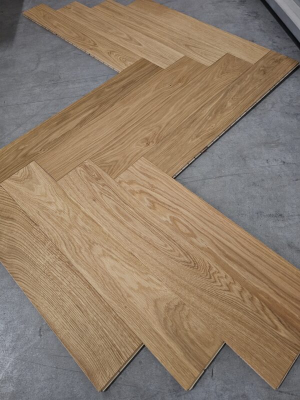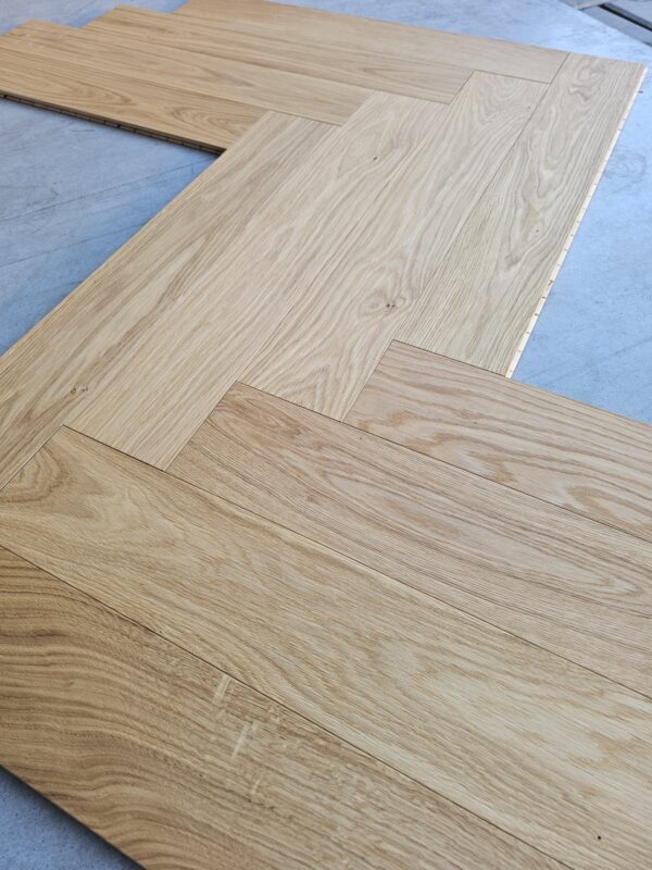 Przedmiotem sprzedaży jest parkiet dębowy (jodełka klasyczna), 2-warstwowy, pokryty