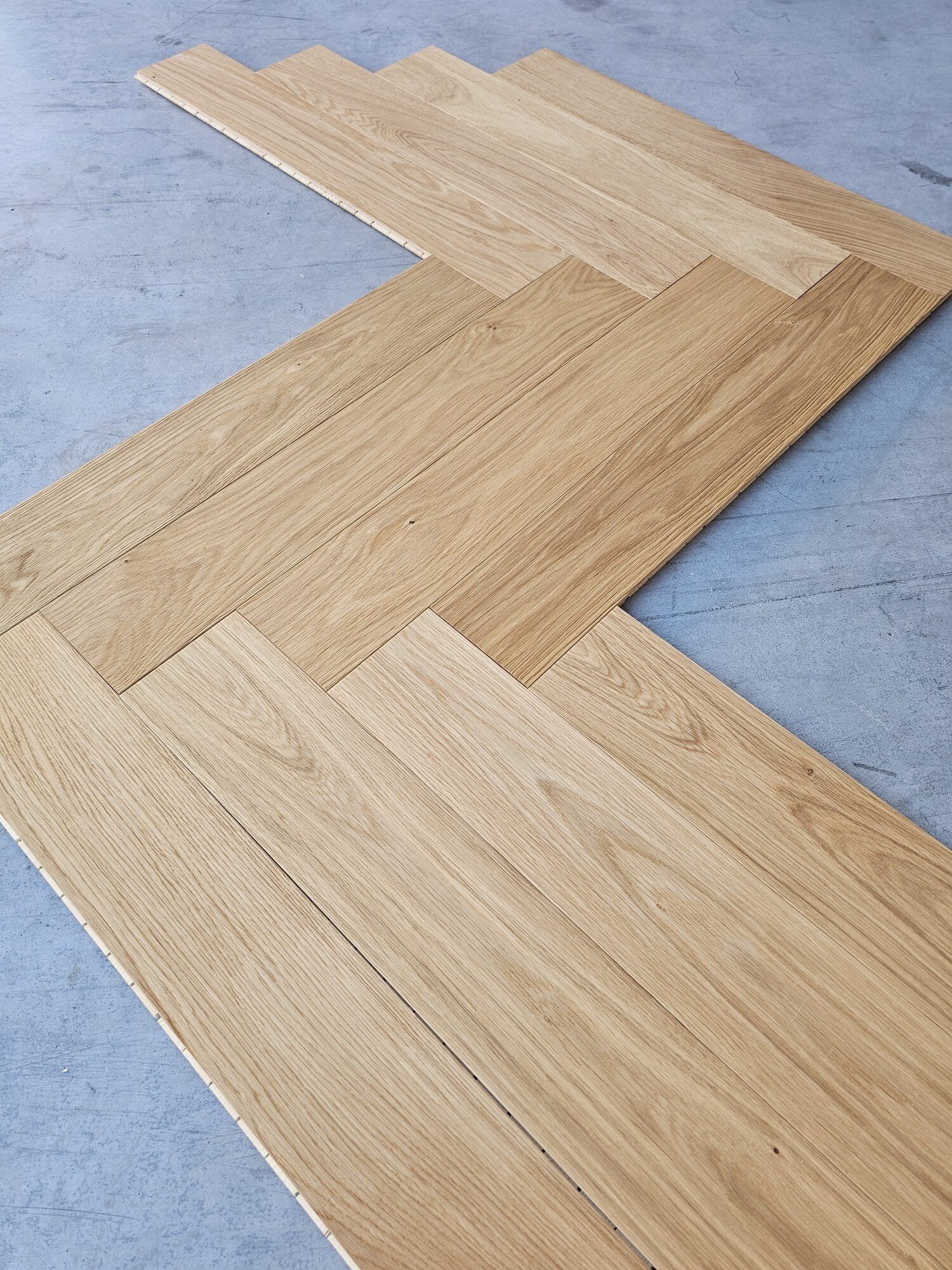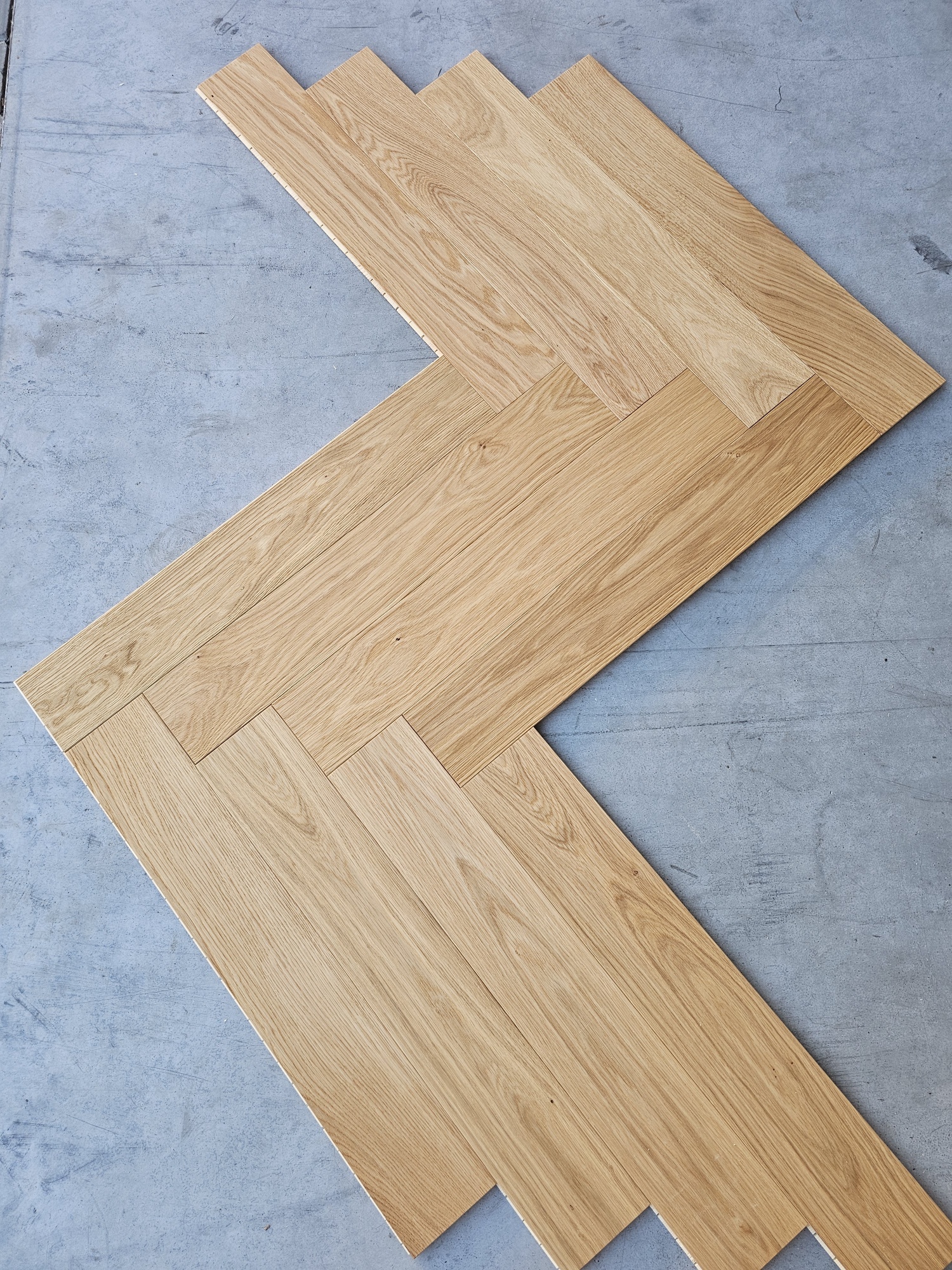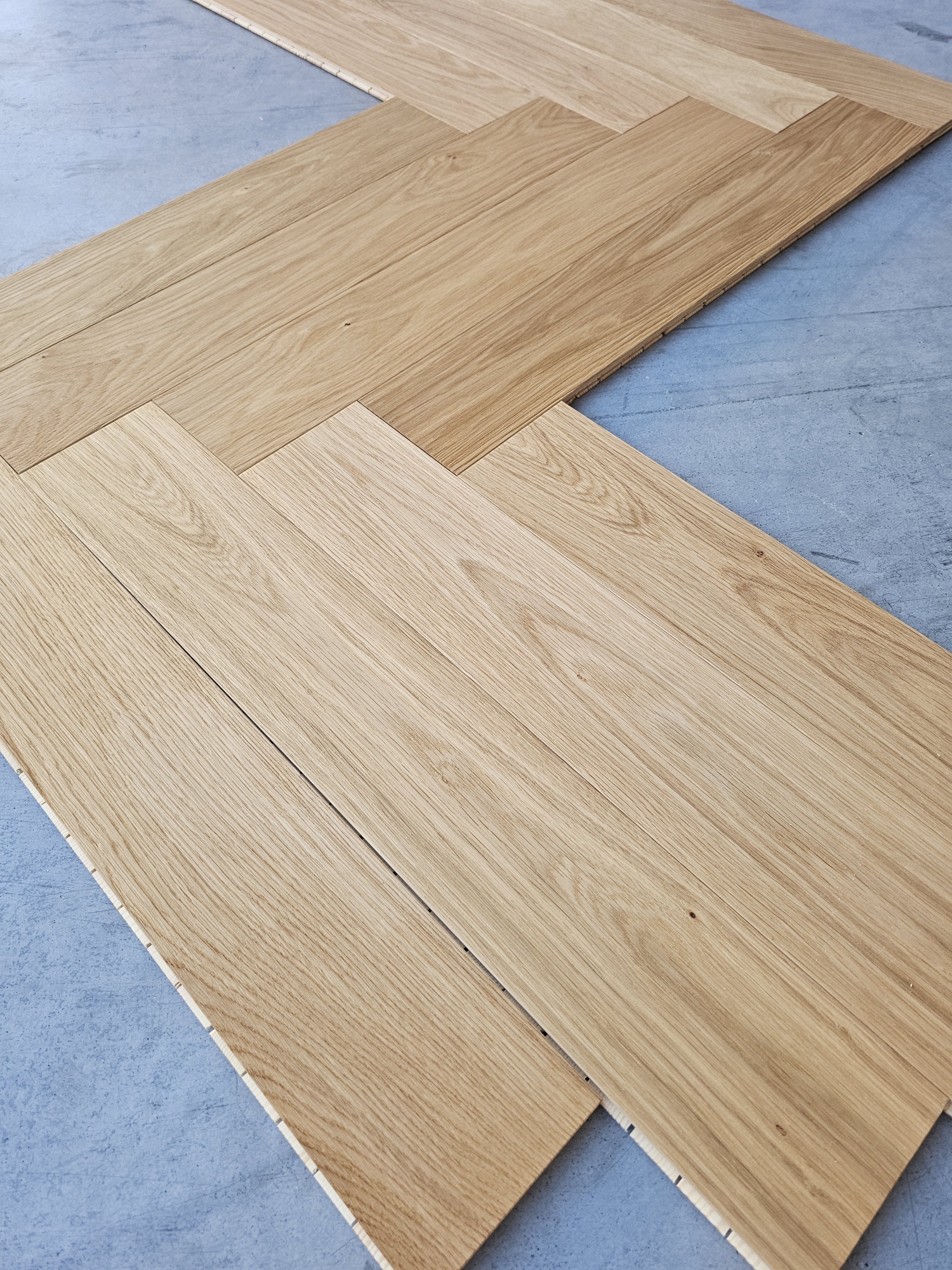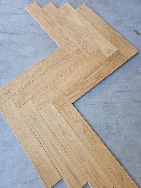 Przedmiotem sprzedaży jest parkiet dębowy (jodełka klasyczna), 2-warstwowy, pokryty