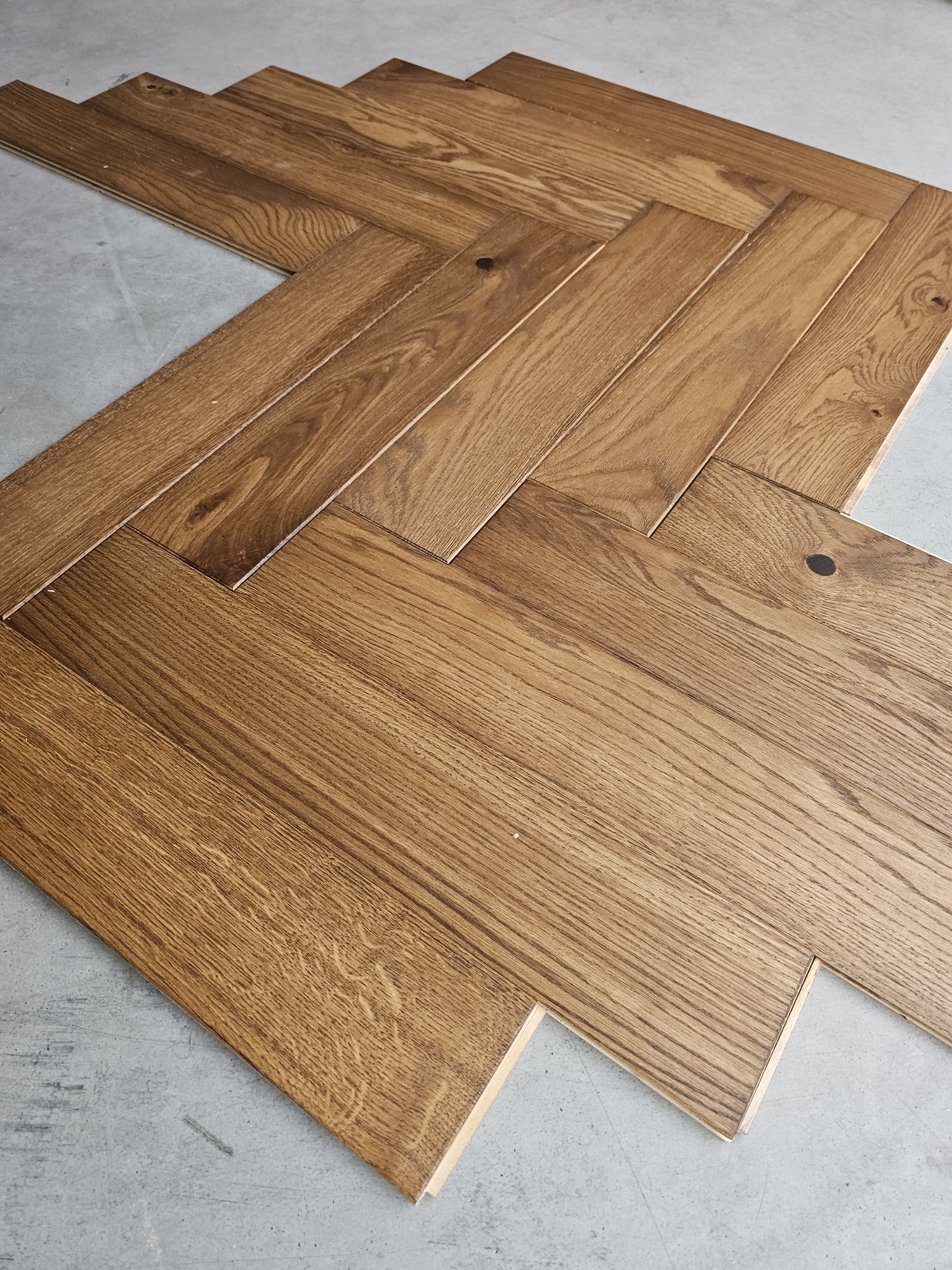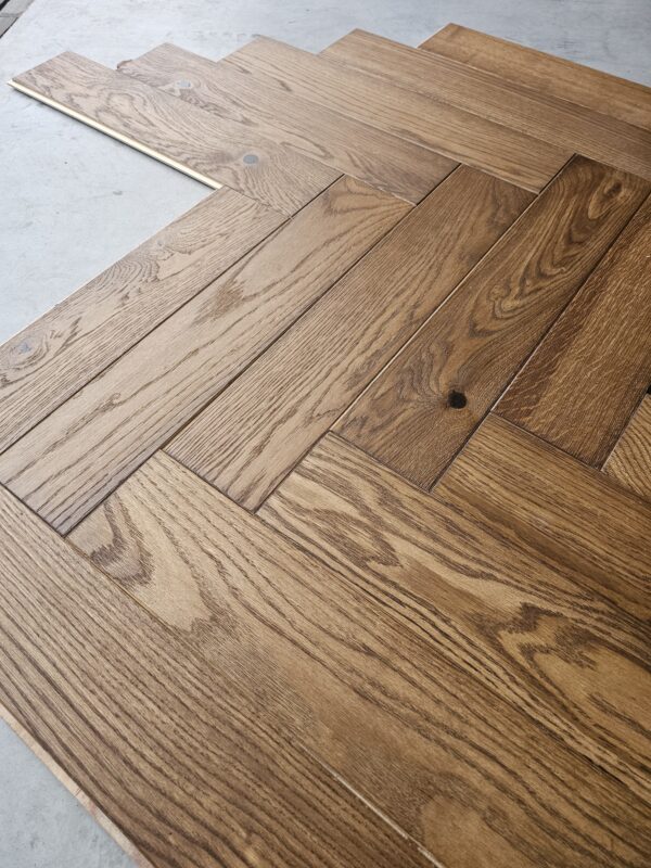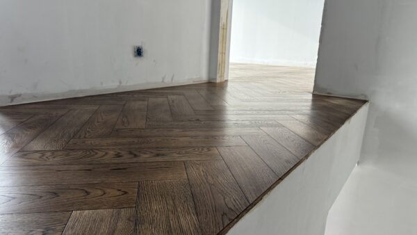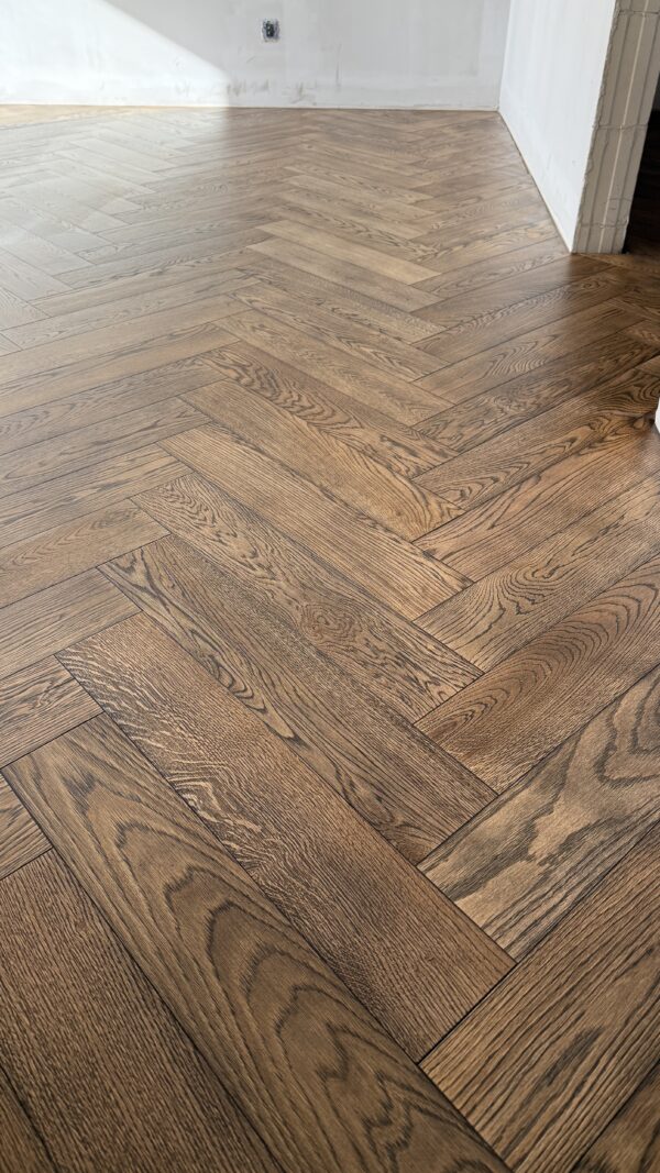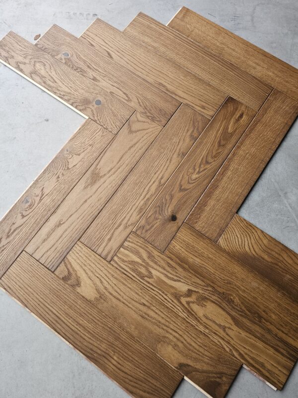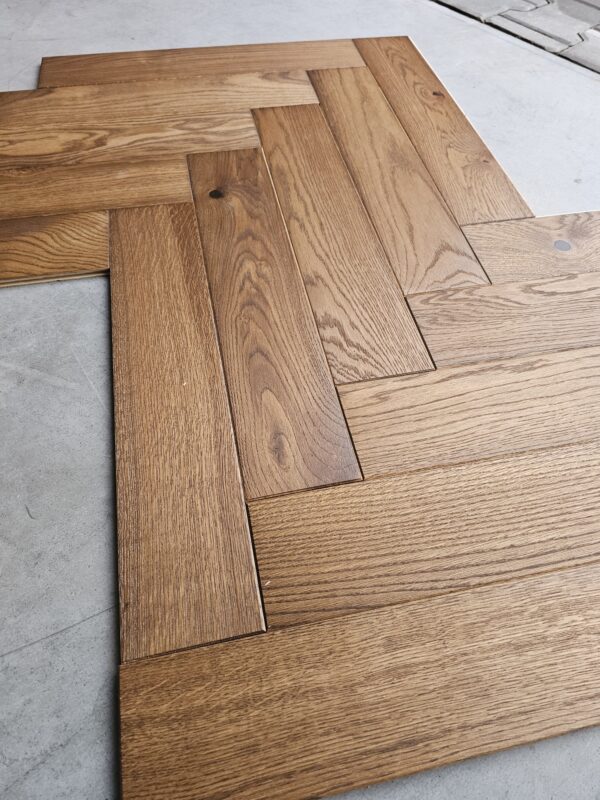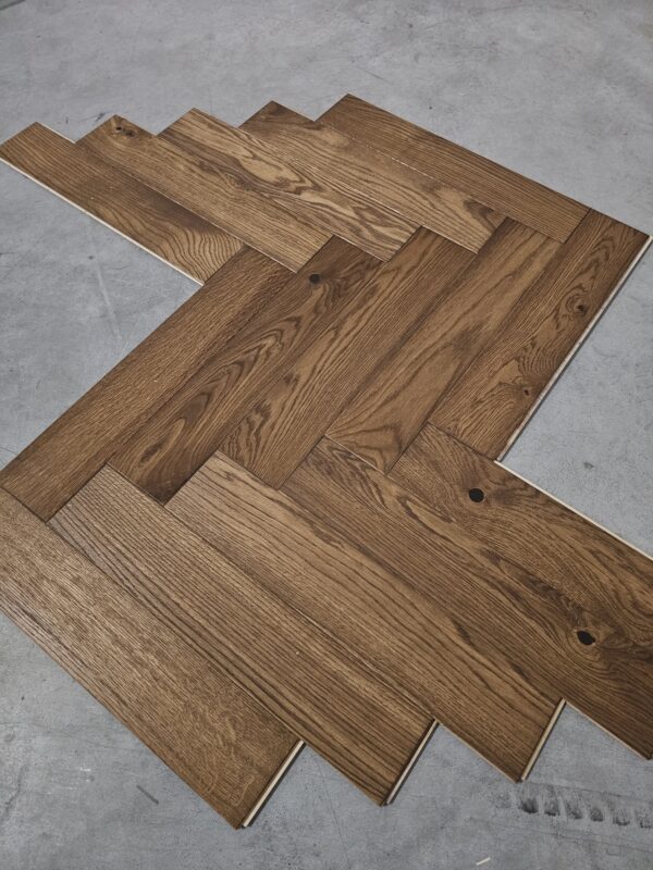 Przedmiotem sprzedaży jest parkiet dębowy (jodełka klasyczna), 2-warstwowy, szczotkowany, wykończony w olejowosku. Produkt dedykowany na ogrzewanie podłogowe.