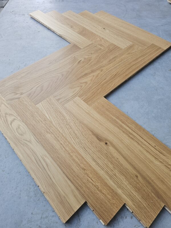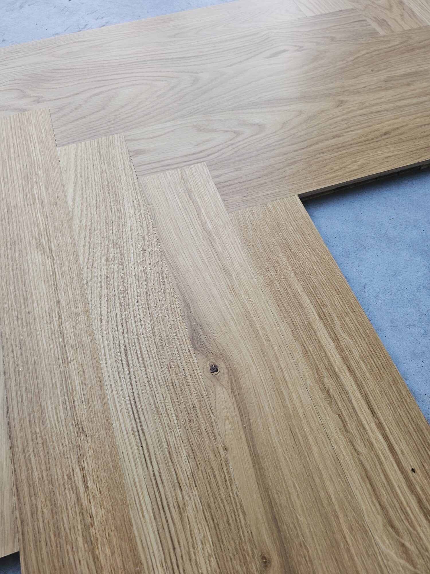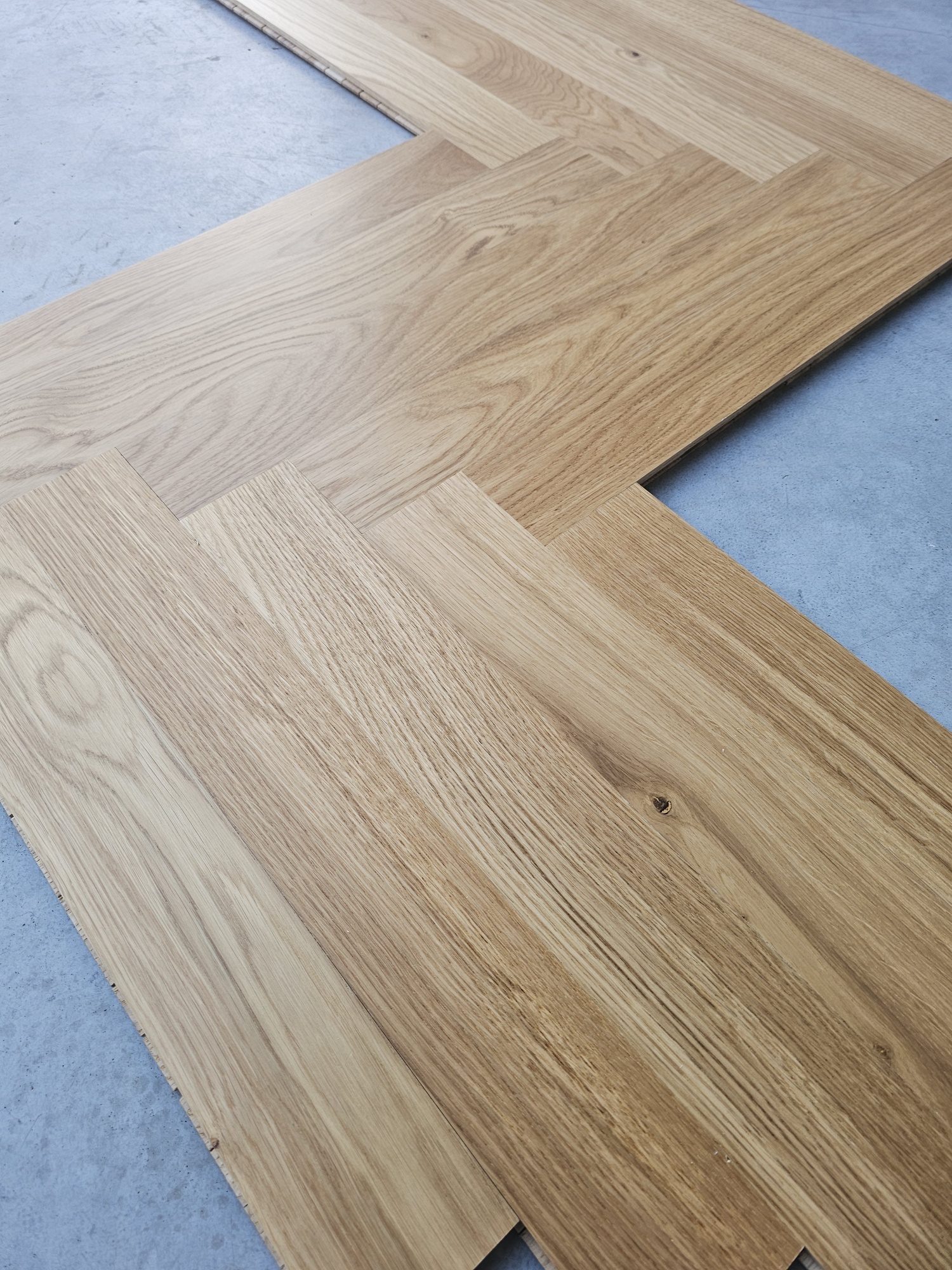 Przedmiotem sprzedaży jest parkiet dębowy (jodełka klasyczna), 2-warstwowy, lakierowany. Produkt dedykowany na ogrzewanie podłogowe.